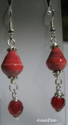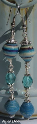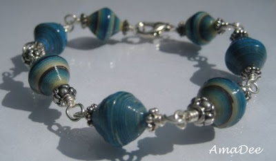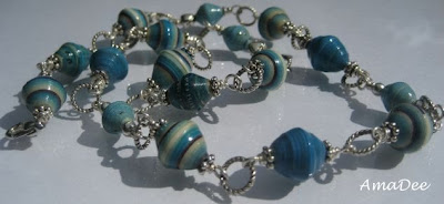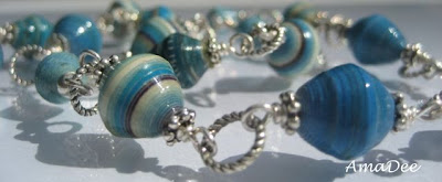 Kesäkoruja kierrätyspaperihelmistä. Helmien alkuperä on Uganda ja niiden tuotto menee hyväntekeväisyyteen. Lisää aiheesta mm. Garring Hands sivuilta. Hopeaa en raaskinut käyttää näissä, sen kiillotuskin olisi ollut hankalaa kun nuo helmet tosiaan on paperia. Joten kaivelin korumetalliosat ja hopeoidunkuparin esiin. Kestää sitten minkä kestää, näillä mennään.